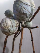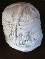 ![]() When I was a student at the Academy we made figure sculptures in clay which were then cast in plaster en route to a more permanent presence in bronze. The procedure of plaster casting involved dipping strips of cloth or burlap into liquid plaster and using it to reinforce structural sequences and seal seams before pouring plaster into the mold. I looked on these objects as potential sculpture, with their intriguing negative images and suggestive loosely drawn contours. In later years I worked directly with plaster dipped cloth and more recently with a variety of textiles impregnated with glue. Cocoons, for example, are made utilizing this method. This in turn led me to conceptual works in which contemporary artifacts such as cups and utensils, coffee makers and irons, souvenirs from beach walks etc are treated as precious ritual objects and are wrapped as carefully as the skeletons of Egyptian Pharaohs. But the outer shapes of these bundles, unlike tomb mummies, do not reveal their contents. Jersey Shore, Morning Coffee, Dining Out and others are designed on this principle to refer to archeology as well as art. A series of X-ray photographs arose from these—continuing to integrate art and science. Some of the photographs count and describe the encapsulated contents of the bundles, others depict and document their original usage before their "burial". Kitchen Bundle and several others don't encase anything but share the intention of Cocoons in that they are mysterious and sinister. It should be noted that my work does not emulate or do homage to Christo and Jeanne Claude. I admire their work as innovative environmental art important because of its monumentality and impermanence and its assertion that we can rethink the relationship of art to our surroundings. Architecture, geological structures etc become part of their art work demonstrating that a new context can suggest new meanings. Like Sol Le Witt and other contemporaries, they demonstrate and redefine the role of the artist by allowing the public to participate in the making of art and its perception. My art is as intimate and intellectual as a book. It continues to question the nature of art and objects rather than focusing on the role of the artist making them. My objects inquire into the nature of mind and art. How do we find and perceive things? What do we value and why? How do we catch a moment or idea so that it can be savored or pondered? Where does science and quantitative inquiry begin and qualitative experience continue and end? What are the overlaps and shared characteristics of these two? How are memories preserved and altered through time? |